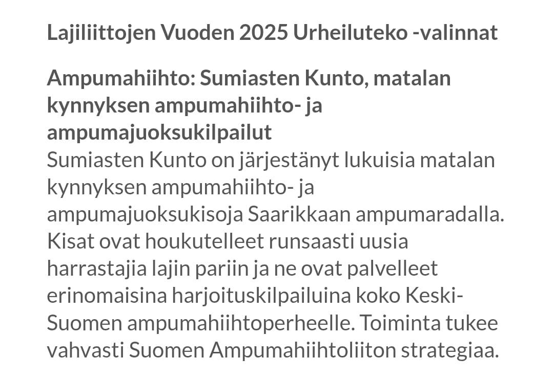 Sumiaisten Kunto Vuoden Urheiluteko 2025